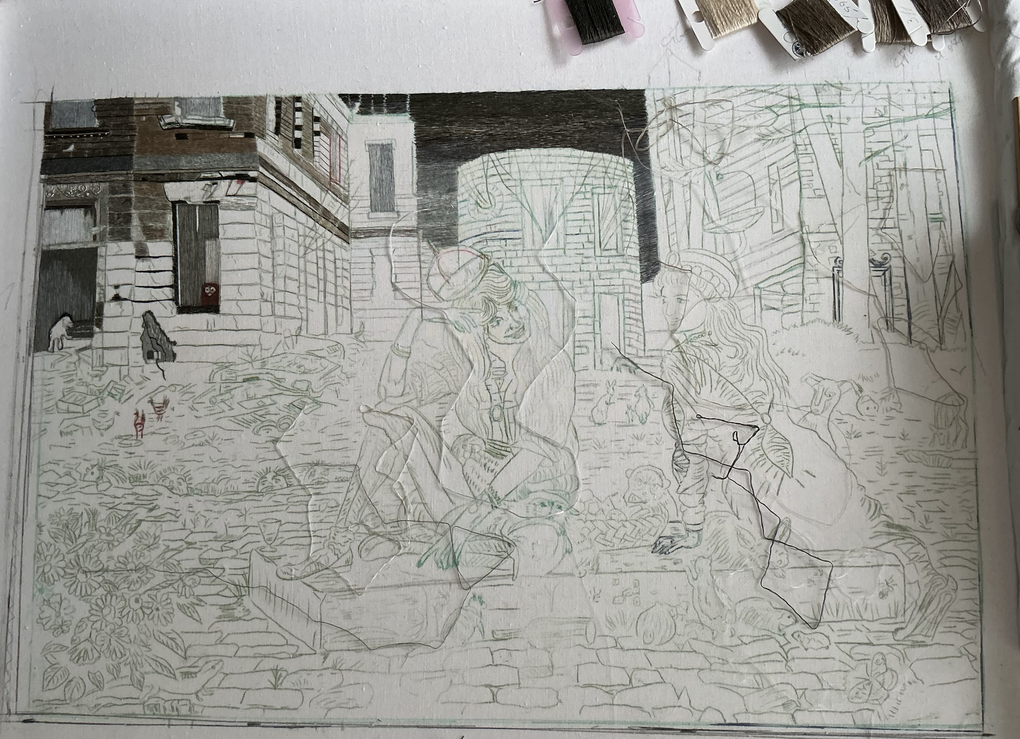 Кроме этого оказалась еще одна проблемка: ткань, на которую рисунок был переведен больше месяца назад и натяжение было отличным, ослабилась и провисла. Хотела натянуть новую на подрамник и переснять контуры по новой. Поняла что это мне не очень хочется делать и нет гарантии что все детали переведу лучше.