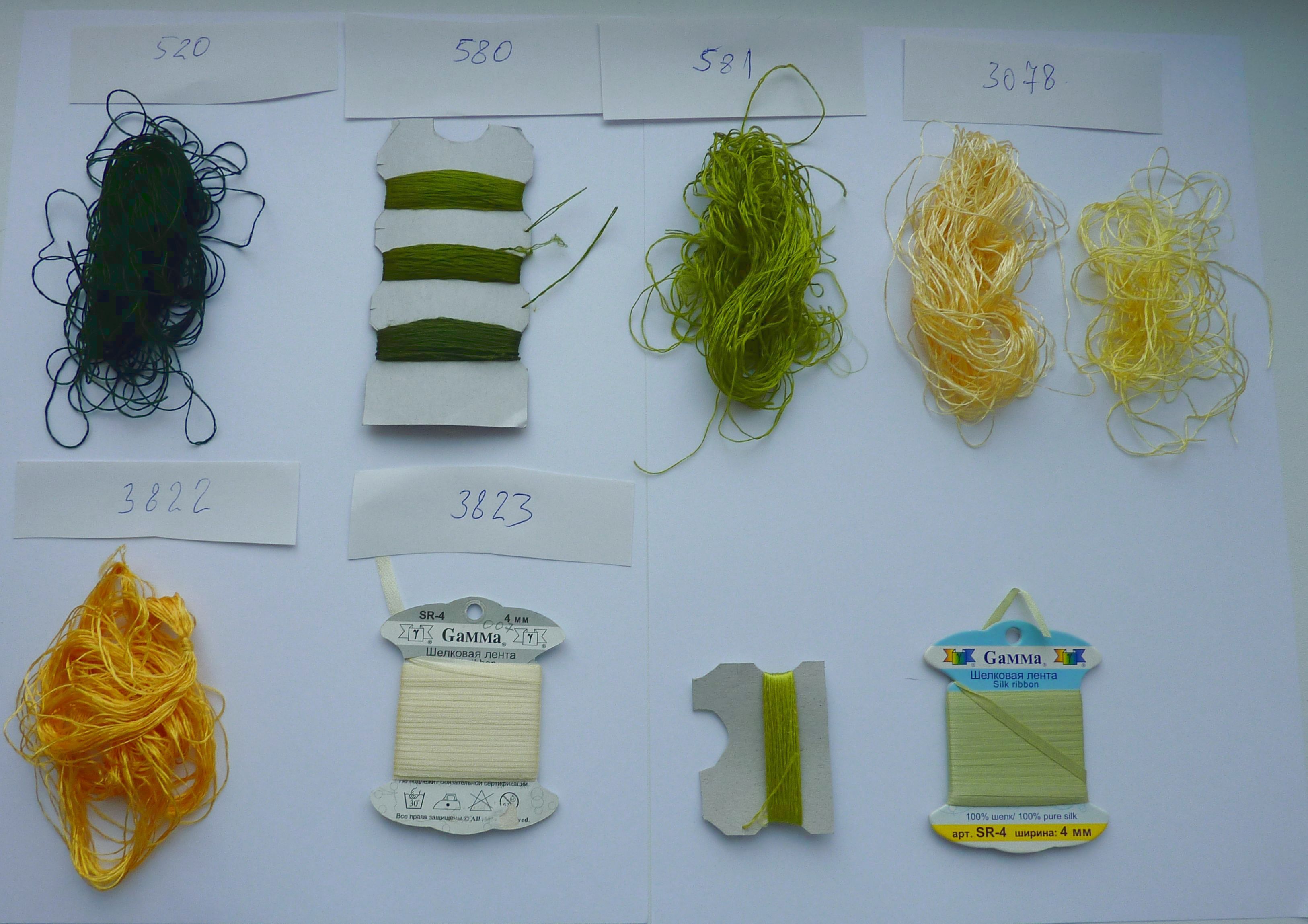 Думаю , что для более светлых узелков может понадобиться шелк совпадающий по оттенкам с ДМС: 580; 581;472;165;3078;3822;3823. Это очень приблизительно!