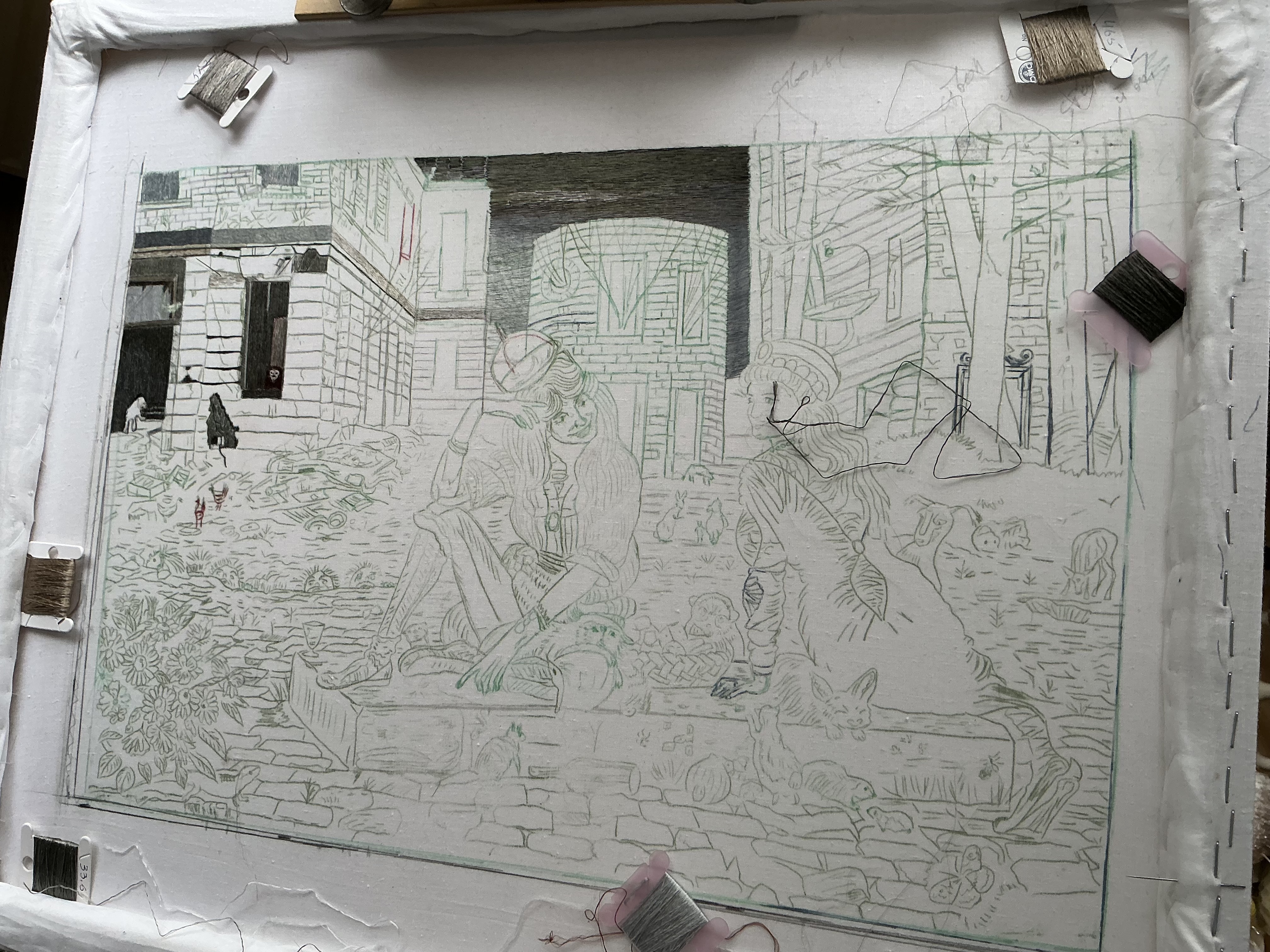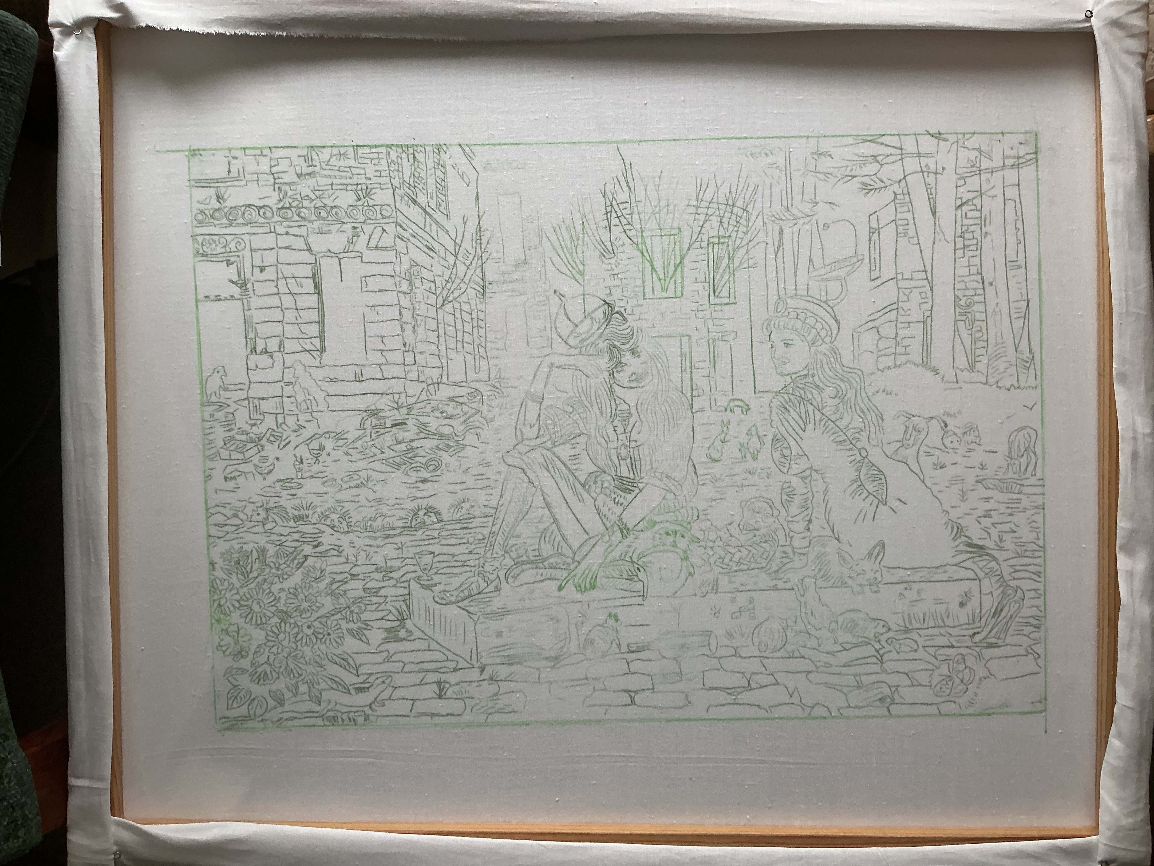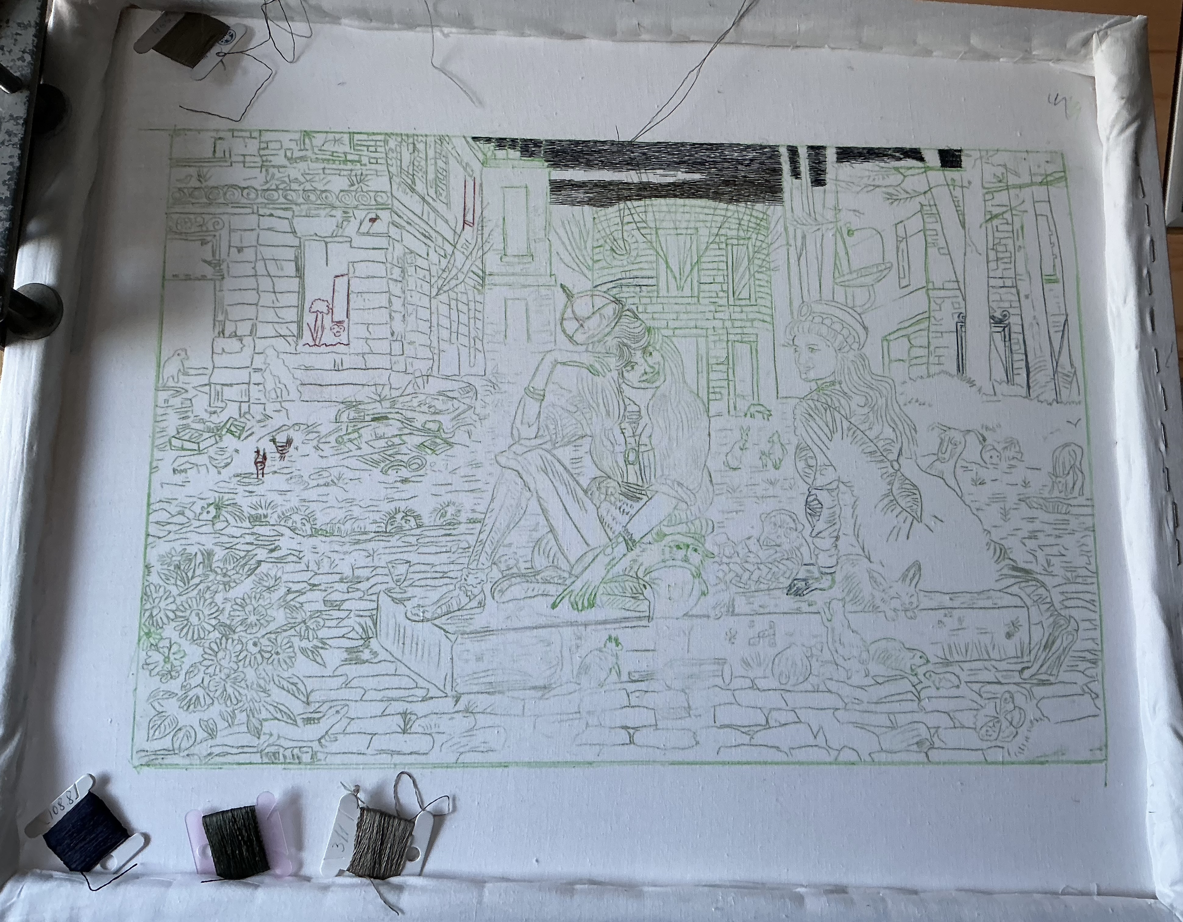 Кроме этого оказалась еще одна проблемка: ткань, на которую рисунок был переведен больше месяца назад и натяжение было отличным, ослабилась и провисла. Хотела натянуть новую на подрамник и переснять контуры по новой. Поняла что это мне не очень хочется делать и нет гарантии что все детали переведу лучше.